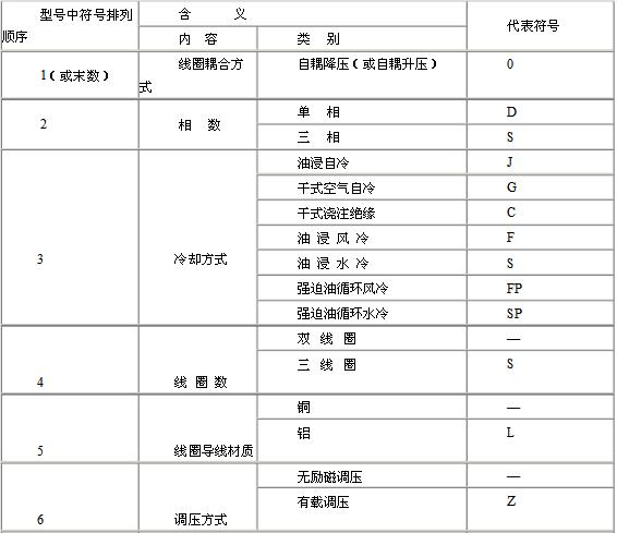 D-单相 S-三相 J-油浸自冷 L-绕组为铝线 Z-又载调压 SC-三相环氧树脂浇注 SG-三相干式自冷 JMB-局部照明变压器 YD-试验用单相变压器 BF(C) -控制变压器(C为C型铁芯结构) DDG-单相干式低压大电流变压器